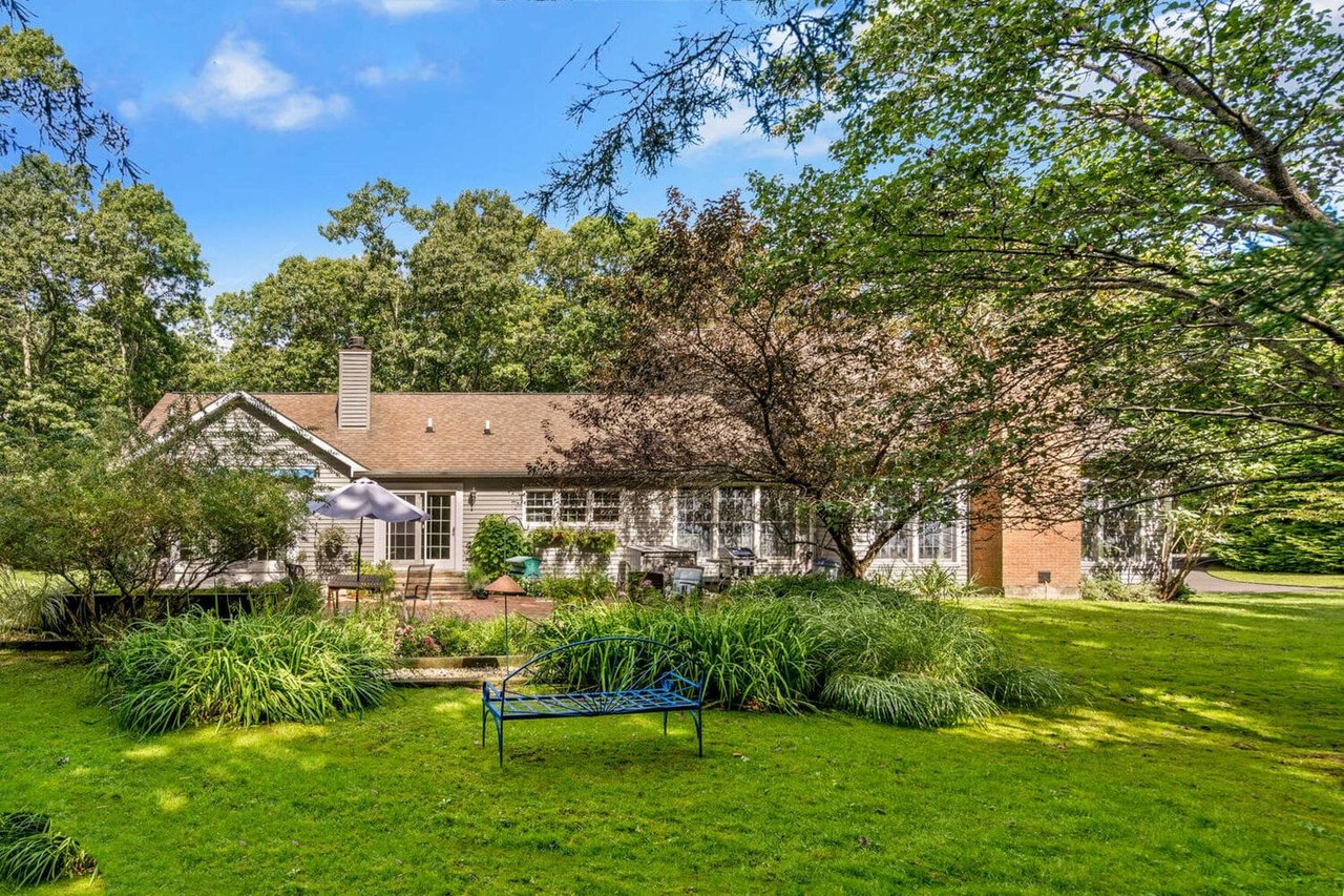 This 2000 custom-built home is sitting pretty on .63 acres just outside the Village, but still part of the Sag Harbor school district. 4 bedrooms, 3 baths and full basement with finish-out height ceilings, all nestled in on lovely grounds. Wonderfully proportioned living room with fireplace with tons of windows affording views of the property and gardens, formal dining room, eat-in kitchen with gas fireplace, library/office with separate entrance and a master bedroom with a generous closet, 2 full baths and a small adjoining bedroom. Upstairs are two equal-size guest bedrooms and a shared full bath. You enter the front door via a lovely covered porch--just perfect for afternoon reading or a glass of something with friends. At the back of the house is a lovely wooden deck area and a slightly lower brick terrace, making for two distinct areas to utilize, also creating a nice visual effect. There is the possibility of creating an under-the-house 1 car garage with some minor landscaping changes and creating a driveway entrance. Ample parking in the car park. Just minutes from Sag Harbor and all it has to offer, bay beaches and also near to Serene Green, one of the best farm stand/boutique food shopping experiences. If they don't have it, you probably don't need it. This house is move-in ready, as it's been very well maintained, or it is ready to receive your function-and-decorative input. Email or text us to see.
